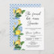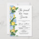 Den moderna Lemon Blommigt Main Squeeze Inbjudningskort för möhippan Lemon themed inbjudningskort för möhippan med en blå och vit blomma, citroner och blad på sidan och en del av dem som delar texten. Hon fann att hennes inbjudan att duscha möhippor med klämma knappar också har ett helt redigerbart monokaléteckensnitt.