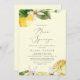 Denna moderna gult, som huvudsakligen pressar inbjudningskort för möhippan, är perfekt för en vår- eller sommarmöhippa. I Medelhavsmodellen finns det klara och vackra citroner med vita blommor och löv av elegant grönt.