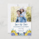 Denna moderna inbjudan till citron bröllop spara datum är perfekt för ett vår eller sommar-bröllop. Den här eleganten är utformad med klara och vackra citroner med elegant blåa blommor och grön. En gult och ett vitt mönster dekorerar baksidan av inbjudan. Designad av Blackberry Boulevard.