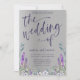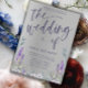 Modern bröllopsinbjudan med elegant stil-typsnitt i lila på silver metallisk bakgrund. Innehåller även originalvattenfärgsverk av lavender, eukalyputus och lila blommor. Anpassa texten om du vill skapa en unik verkligen.