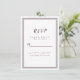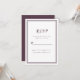 Enkel och elegant bröllop RSVP bifogad kort har en minimalistisk design med en dubbel ramkant i trendig lila cassis på en krispig vit bakgrund. Personifiera med datumet för ditt bröllop. Utrymmen finns för dina gäster att lägga till sina namn och svar för ett retursvar. Bokstäver och skrift är i matchande cassis. Baksidan av kortet är matchande enfärgad lila cassis.