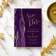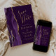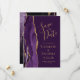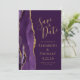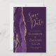 Det moderna bröllop spara datum-kortet från elegantens lämnat kant har en lila vattenfärgsagat gräns som trimmas med faux guld glitter. Anpassadet kombinerar handskrift, rityta och kursivt typsnitt med guld-färgad på rikens plommonbakgrund. Den omvända sidan har en matchande lila- och guld-agate-design.