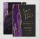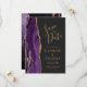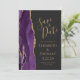 Den vänstra kanten på detta eleganta moderna bröllopskort för att spara datum har en lila akvarellagat-kant med falskt guldglitter. Den anpassningsbara texten kombinerar guldfärgad handskrift, kopparplåt och kursiv stil på en skiffer svart bakgrund. Baksidan har en matchande lila och guld agat-design.