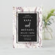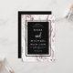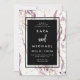 Dessa moderna, eleganta bröllopsinbjudningar har en lila och vit marmorerad bakgrund med falska guldflingor utspridda. Den mittersta ytan innehåller en stilren svart ram med din inbjudantext i trendig vit typografi.