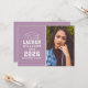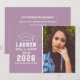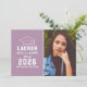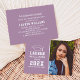 Meddela din högskola eller högskola student i stil med detta tillkännagivande och denna partiinbjudan från studenten. Dubbelsidiga kort har en hög porträtt i student med gradsockel och enkel och modern vit typografi. Du kan ändra bakgrunden för lavender/violett lila till ett annat färg med funktionen "Anpassa den" och sedan Redigera/Bakgrund för att välja ett annat färg.