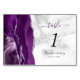 Det moderna kortet för bordsnummer i bröllop som är lämnat kant i eleganten har en lila vattenfärgsagat i gräns som trimmas med faux silver glitter. Anpassadet kombinerar handskriftsskript för mörk lila med svart kursiv och kaperplåt typsnitt på grått och vit marmorbakgrund.