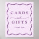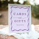 Lägg till en snyggt till bröllop, möhippa, babydusch, studentfest eller annan speciell händelse med den här moderna Lilan Vågigt Ram-kort och presentkort. Konstruktionstecknet "Cards and Gifts" i fetstil med lila omgiven av en lila vågigt gräns kontrasterar mot en lätt bakgrund av lilan. Anpassa tecknet för styrkort och presentationer med anpassningsbarna nedan. Välj mellan utskriftsalternativ för professionell eller alternativ för omedelbar nedladdning, vilket ger dig möjlighet att göra det enkelt.
