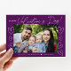 Modern hjärtans dagskort med "Glad Alla hjärtans dag" i ett vitt skript i trendiget med handdragna hjärtan längs kortets sidor mot lila bakgrund. Vågräts foto visas nära mitten i designen. Anpassa lila Valentinns dagskort genom att lägga till ditt namn och året med vita bokstäver. Kortet återgår till visning mönster i lilans hjärtan.
