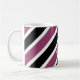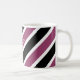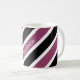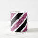 Mugg har ett diagonalt tvärgående mönster i vitt, svart och lila. Anpassa det med ditt namn med vitt teckensnitt placerat diagonalt över lila rand.