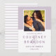 Modern bröllop spara datum-annonskort har ett fyrkantigt foto med förlovning i ljuslavender/lilac lila med ett enkelt och minimalistiskt stil-monogram av bruden och groom namn med ett skript för elegant. Anpassa datumtexten med datum och plats i bröllop. På baksidan av kortet finns en smal mönster av tunt lila och vitt vågrät rand.