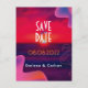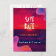 Ett modernt, livfullt lila solnedgångs Spara datum-annonserings vykort. Denna iögonfallande, djärva design i levande röd, lila och orange med en tropisk touch och chic typografi kommer att få din kommande bröllopsannonsering att sticka ut! Du kan lägga till ett personligt meddelande på baksidan av vykortet och vi har också lagt till några designelement från framsidan för att göra det lite mer unikt.