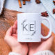 Modern, löv, monogram, initialer, nyproducerat presentkaffe mugg. Ett rent klassiskt typsnitt med en smakfull enkel ruta gräns och löv gren är en tankfull och unik bröllop-gåva till bruden och brudgummen. Anpassa den med sina personuppgifter och kaffet älskare kommer att ha en bröllop-keepy att uppskatta i flera år för komen. Hitta andra underbara och unika nylanserade presenter eller bröllopsgåvor i den moderna enkla Bröllop-presentationen i den vackra Abstrakten Store.