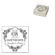 Denna moderna "Save the Date"-gummi frimärke har ett löv ram med ett par namn och datum.