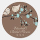 Rund dekal av love birds med Möhippa och med brid och groomfåglar sitta på gren med turkos blåa blommor på chokladbrun bakgrund. Underbar för möhippans favoritmärken och kuvertförseglingar! Anpassa med din möhippa så är du redo att gå! Matchande inbjudningar och frimärken finns i vår butik www.celebrateitinvites.com.