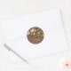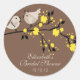 Rund dekal av love birds med Möhippa och med brid och groomfåglar sitta på gren med gula blommor på chokladbrun bakgrund. Underbar för möhippans favoritmärken och kuvertförseglingar! Anpassa med din möhippa så är du redo att gå! Matchning av inbjudningar och porto frimärke finns i vår butik www.celebrateitinvites.com.
