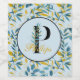 Vackra designegenskaper för blå och guld lämnar på ljusblå bakgrund med monogram/ början P med löv som förskönande i mittcirkeln. Anpassa till namn i skriptteckensnitt för gult guld färg