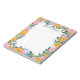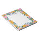 Beautiful floral notepad with a striking floral frame creating a border around the notepad. The flowers and greenery are hand-drawn on a tablet in pink and yellow, and green and blue. The flowers decorate the borders, leaving plenty of room to write down notes, reminders, to do lists and more. Personalize with your name at the top in a very dark blue script.