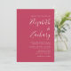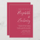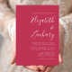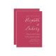 Den här enkla, moderna bröllopsinbjudan innehåller vit text på magentans bakgrund. Lägg till bildens och bildens namn i snyggtens handskriftsgrafi och detaljerna i sans serif-teckensnitt. Baksidan är solid magenta.