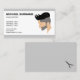 Det här anpassningsbara affärskortet hårfrisör/hårstilist/barbertema innehåller Desteis illustration av en mans profil. Mannen har ett modernt hårklipp som är kort på sidorna och längre upp. Mannen har också ett kort-skägg. Vid sidan av bilden finns det textområden som kan anpassas efter namn, yrke och kontaktinformation. Bakgrunden färg är vit med grått gräns på ovansidan och grund. På baksidan finns en liten svart silhuett av saxar på en grått-bakgrund färg.