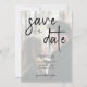 Minimalistiskt bröllop spara datum-kort med två förlovningar i svart och vitt med ett modernt, handskrivet calligrafskript. ++++++++++ Lämpligt för alla årstider snyggt modernt tema bröllop. +++++++++ Anpassa den med anpassningsbar 2-foton, din text och din QR-kod (genereras automatiskt med länken) till webbplatsen.