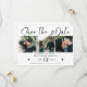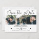 Trendigets minimalistiska snyggt, svart och vitt, modernt calligraphy-skript, bröllop spara datum-kort med 3 fotokollage. ++++++++++ Lämpligt för alla säsonger och teman. ++++++++++ Enkel att anpassa med bilder och information på båda sidor.