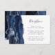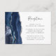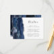 Den lämnat kant i eleganten har ett modernt mottagningskort för bröllopsresor med en marin blå vattenfärgsagat gräns som trimmas med faux silver glitter. Rubriken visas i handskriftsskript, med anpassade nedan i färgkodsteckensnitt för kol-grått på vit bakgrund. Den omvända sidan har en matchande marin blå och silver-agate-design.