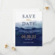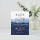 Detta moderna spara datum-kort har en vacker marinblå akvarellbakgrund med elegant typografi.