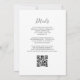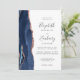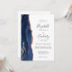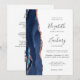 Den vänstra kanten på denna eleganta moderna bröllopsinbjudan har en marinblå akvatint agat-kant med falskt roseguld-glitter. Den anpassningsbara texten kombinerar handskrift, kopparstick och kursiva stilar i kolgrå på vit bakgrund. Baksidan ger utrymme för detaljer om bröllopet på en enfärgat vit bakgrund, tillsammans med en QR-kod som gästerna kan skanna för att besöka er webbplats och svara, vilket sparar kostnaden för att trycka och skicka separata svars-kort.