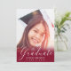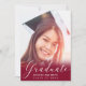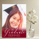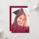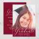 Det här moderna minimalistiska studenten-meddelandet och festinbjudan innehåller ditt foto på framsidan med ett övertäckt vitt kalligrafiskt skript på maronen som lyder "Student" med ditt namn och klass/år för att anpassa dig. Varvets baksida är en maron med vit text med all information från studenten och party som du behöver för att anpassa. Designad av Susan Coffey.