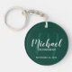 Lägg till en personlig beröring till bröllop med nyckelkedjan personlig marskalkars. Den här nyckelkedjan har marskalkarnas namn i det vita, moderna typsnittet stil och monogrammet i light emerald grönt, det moderna typsnittet stil som bakgrund med rubrik och bröllop datum i det vita, moderna sans serif-typsnittet stil på den smaragda personligens bakgrund. Perfekt för den bäste mannen, far av bruden och mycket mer.