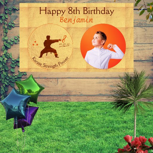 Styrkan hos martialkonsten finns i en modern karatsilhuettdesign med personlig namn i bränd orange och guld som symboliserar medaljer i karate guld. Anpassa ålder, namn och alla uppgifter för perfektens födelsedagsinbjudan.