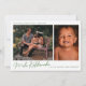 Ett modernt helgdag-kort med ord "Mele Kalikimaka" fyllt med en faux metallisk folieeffekt och platshållare för två foton. Baksidan har platshållartext för ditt eget helgdag brev. © 2020-Present | Sprit Olive | Alla Höger reserverade.