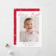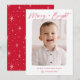 Cute, modernt fotokort för helgdag med frasen "Merry & Bright" i ett rött handskript. Lodräts foto visas med ett vitt, grovt kant gräns. Anpassa kortets framsida genom att lägga till en anpassningsbar hälsning med din familj namn som visas nedan. Kortet återgår till visning med röd bakgrund med en vit mousserande stjärna mönster.