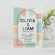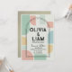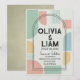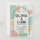 Sätt tonen för din unika fest med denna iögonfallande moderna mid-century geometriska bröllopsinbjudan. Med en livfull men sofistikerad palett i mintgrön, mjuk persika och senapsgul blandar denna design retroinspiration med modern stil. Layouten visar djärva abstrakta former och en slående dubbelbågsram som elegant framhäver era namn och evenemangsinformation.