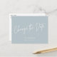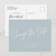 Anpassningsbar-designade bröllop senarelägger/ändrar det datum då vykortet ska ha en modernt, vitt handskriftsformat på dammig blå bakgrund.