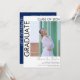Modern Minimalistisk Två Foto Examen Meddelande & Examen Fest Inbjudan med svart text på vit bakgrund. Baksidan är marinblå med vit text