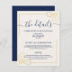 . Den här moderna och minimala designen är lätt att anpassa, och det är ett underbart bröllop nödvändigt krav. Enkla faux löv-former mot en texturerad bakgrund med vattenfärg och med handskriven stil-typografi i ett marinblått ge är denna unika inbjudan och elegantens utseende.