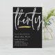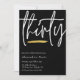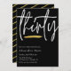 Fira de stora 3 0 trettioårsdagen i stil med denna moderna trendiga inbjudan till 30-årsfirande. Designen har ordet "trettio" i ett modernt handskrivet script-teckensnitt med en vacker guldglitter-glansig penseldrag. Nedre vänstra hörnet på kortet visar detaljerna om födelsedagsfirandet som kan anpassas helt efter dina behov. Baksidan har ett vackert randigt guldglitter-mönster.