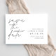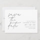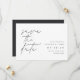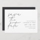 Enkel text och elegant bröllop sparar datumet för modernt minimalistiskt par "spara datumet" i handskrivet skript som är justerat till lämnat. Dina uppgifter om bröllop visas i klassiskt tecken på högerna. Använda baksidan för att dela mer information med dina gäster.