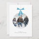 Ditt familjefoto tar plats på detta Moderna Minimala Ornaments Julkort med Foto. En luftig geometrisk design med en rund fotomall som simulerar en hängande julgransprydnad med ett stiliserat tealblått band och ett enkelt personligt namn och hälsning.