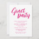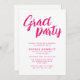 Den här inbjudan utstrålar sofistikering och enkelhet med en modern minimal estetik. Paletten färg är strikt rosa och vit, vilket ger ett elegant, tidlöst utseende. Ord "Grad Party" tar mittsteget, skrivet i ett penselskript som fångar öga och som lägger till en lekfull chic till layouten. Nedan visningar rent, sans-serif-typsnitt på ett strukturerat och organiserat sätt evenemangsdetaljerna.