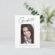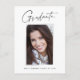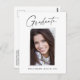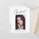 Ren, trendig, modern och elegant "Foto"-vykort för studenten, med inslag av modern text med ett unikt calligraphy-skript i bläck. Student bild på kortets framsida accentueras med en delikat och minimalistisk övertoningsmarkör. Kortets baksida ger personlig textutrymmen för information om studenten eller kan raderas om du vill skicka ett meddelande till skrivan. Svartvit eller anpassa bakgrunden så att den passar din skolas primära färg eller valfritt färg. Perfekt för högstadiet, högskolan och universiteten grad student.