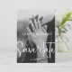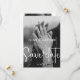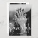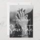 Meddela din speciella dag med stil med detta eleganta svart-vita Spara datum-kort. Med en romantisk förlovningsfotografibakgrund, modern typografi och anpassningsbara namn och datum är det det perfekta första intrycket för din bröllopsfirande. Perfekt för par som älskar en ren, tidlös estetik.