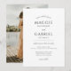 En enkel elegant modern minimalist typografi bröllopsinbjudan med ett modernt skript och en serif-typ inspirerad av romerska inskriptioner från första århundradet, och baserad på klassiska proportioner. Baksidan av inbjudan har ett elegant bröllopsfoto. Personifiera med ditt eget uppladdade foto. Ren och modern stil. Tillgänglig i tryck, som digital nedladdning eller båda!