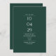 Ett modernt, minimalistiskt spara-the-date-kort med speciella datum och bröllop-detaljer som finns i klassisk, chic-typografi på en framväxande grönt. Designad av Thisisnotme©