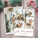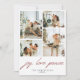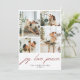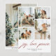 Modern minimalist julkort med ”glädje. kärlek. fred.” i rött handskrivet typsnitt med fyra av dina favorit familjefoton på framsidan och en på baksidan. Lägg till ett personligt meddelande, familjeuppdateringar eller nyårshälsningar på baksidan.