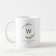 Customizable mug featuring a minimalist watercolor wreath with red floral and green foliage accents. This elegant wreath frames a monogram with the family name and year underneath. Easy to personalize and makes a great gift.