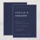 Den estetiska känslan: Framkalla elegansen från en stjärnklar kväll med denna midnattsblå bröllopsinbjudan, som har djupa marinblå nyanser som skapar en formell, klassisk-modern atmosfär. Designad för paret som värdesätter tidlös dramatik, utgör den mörka indigo-bakgrunden en sofistikerad duk för en unik typografisk hierarki: namnen presenteras i krispiga, slående vitt för att sticka ut, medan de stödjande detaljerna är satta i ett raffinerat ljust grått för en distingerad, flerdimensionell look. Den redaktionellt inspirerade layouten använder den samtida Dongle-teckensnittet i fet, versal typografi för att skapa en galleri-liknande look som är både tidlös och slående aktuell.