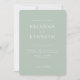 Skapa ett tidlöst första intryck med denna moderna minimalistiska bröllopsinbjudan, designad för par som älskar rena linjer och elegant enkelhet. Mot en mjuk, grön bakgrund framträder denna design med brudens och brudgummens namn som en djärv fokuspunkt, presenterade i en förfinad modern serif-teckensnitt. Den minimalistiska layouten låter namnen ta huvudrollen medan evenemangets detaljer är subtilt arrangerade i kompletterande typografi för en snygg och sofistikerad look.