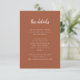 Dessa eleganta, minimalistiska bröllopsgästinformationskort har en modern vit skrifttypografi och ren, sans serif-text på en boho-terrakotta-bakgrund för en enkel och stilren design som du kommer att älska. Du kan använda dessa kort för köranvisningar, mottagnings- eller transportinformation, hotell- eller boendeinformation och alla andra bröllopsdetaljer som dina gäster behöver veta.